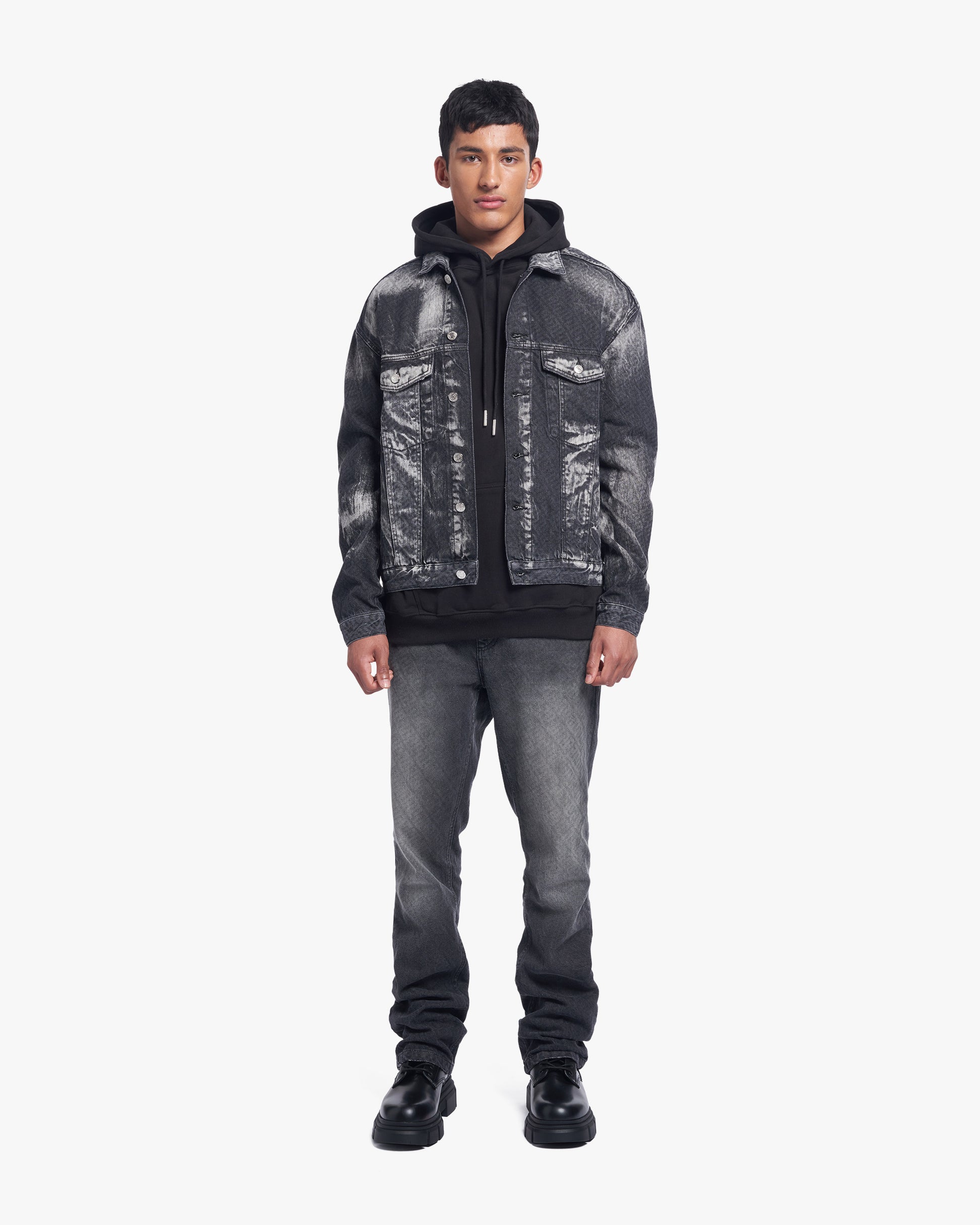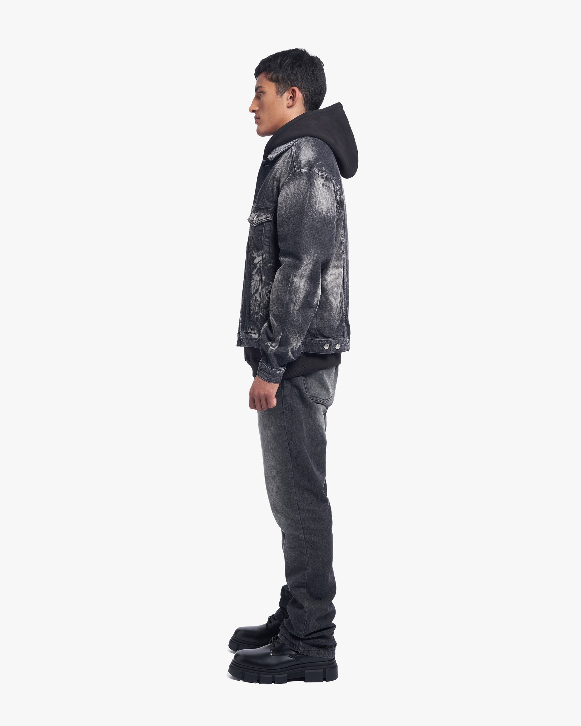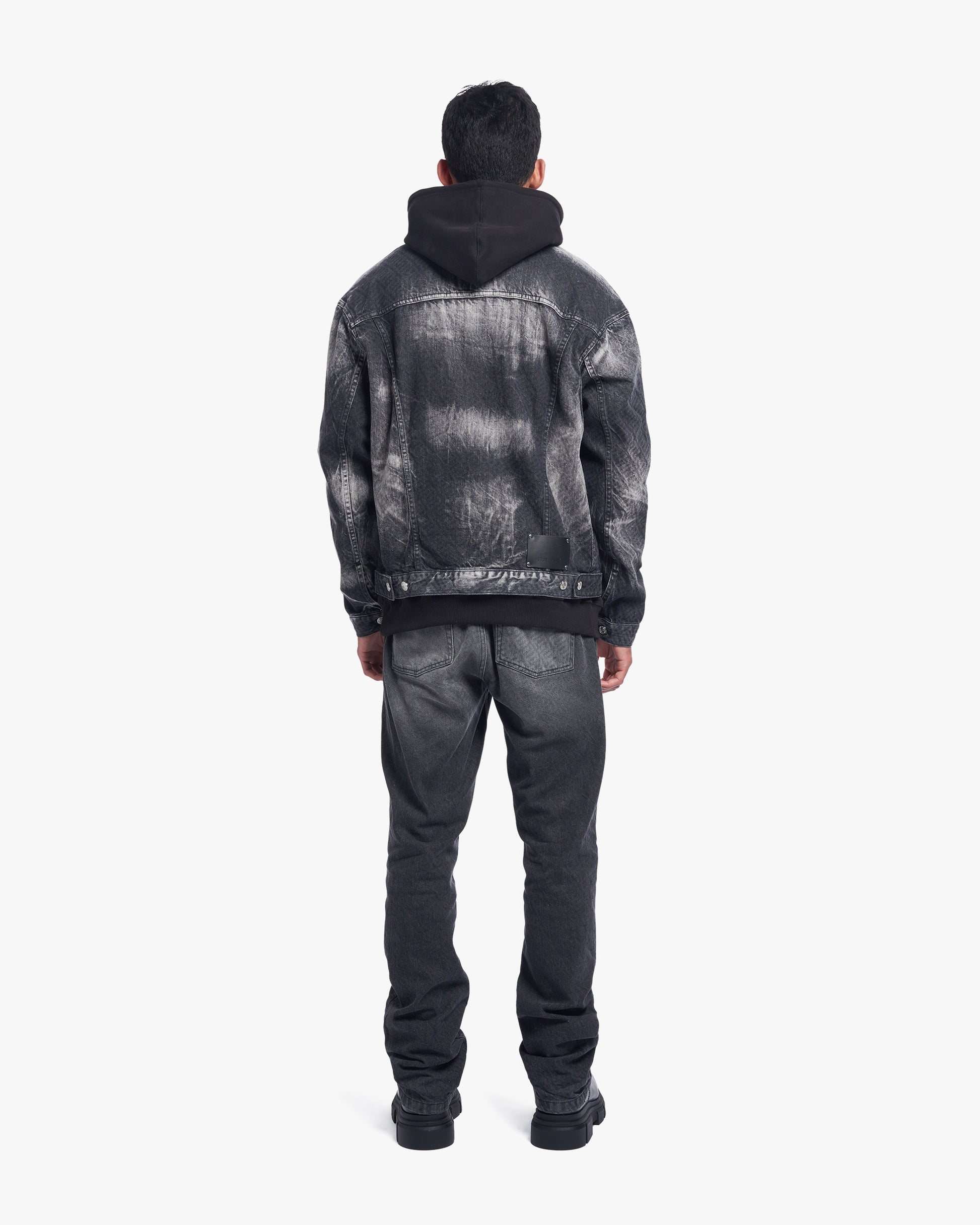 Up-cycled and distressed oversized denim jacket