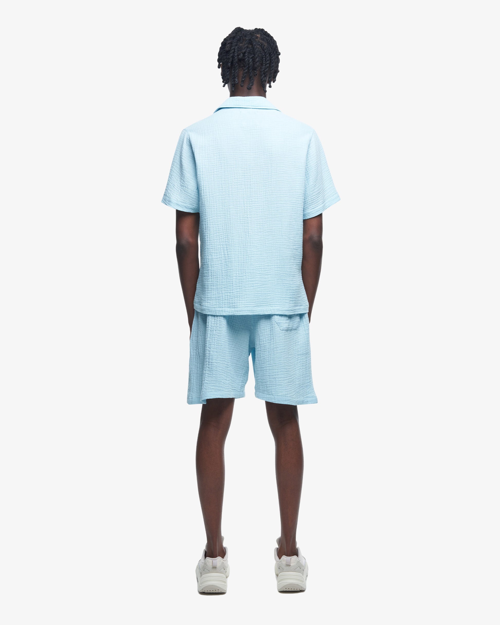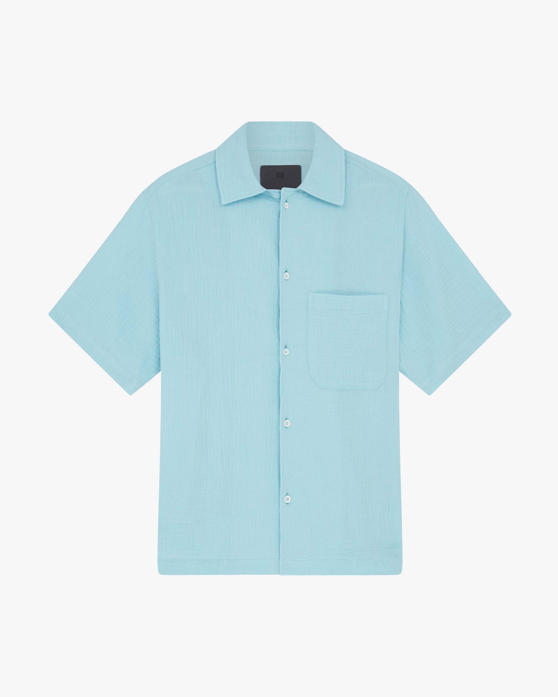 Loose fit open collared seersucker cotton gauze 'camp' shirt with convertible collar